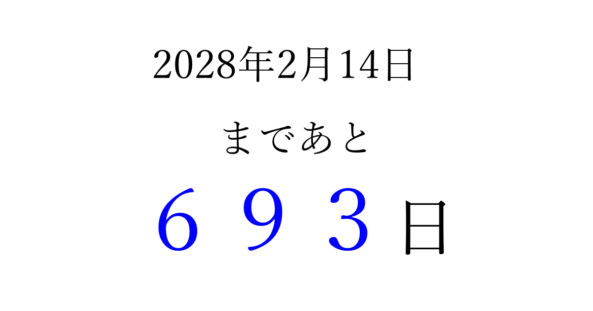 2028年2月14日(月)まで あと 999 日です 追加すると、トップページからすぐ選べるようになります ※2026/03/23現在の結果です。 最新の状態に更新する ↓シェアして、タイムライン上にカウントダウンを表示しよう!↓ 📤 この結果を共有する Tweet シェア Threads Bluesky 別の日付でカウントダウン 2028年2月のカレンダー このページをブックマークに追加すると、いつでもカウントダウンを確認できます。 (PC: Ctrl+D / Mac: ⌘+D) hitome-notes.comでは以下のページも運営しています。 指定日と期間から日付を計算 | ガチャ確率計算・シミュレーション | プライバシー・ポリシー 運営者:Avocado