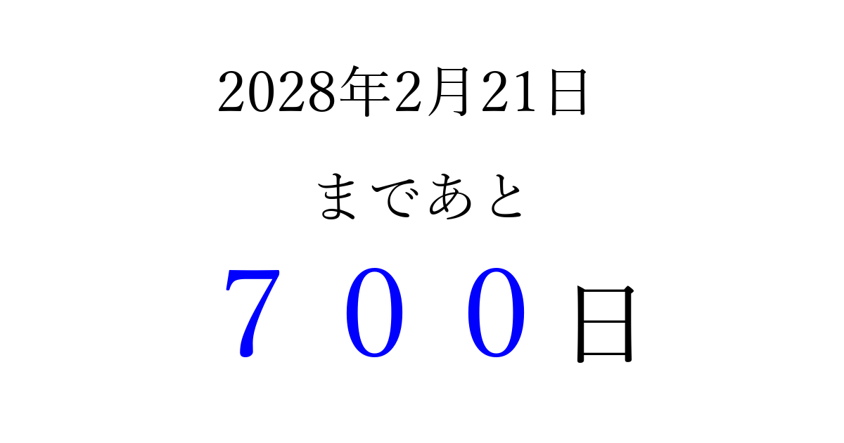 2028年2月21日(月)まで あと 999 日です 追加すると、トップページからすぐ選べるようになります ※2026/03/23現在の結果です。 最新の状態に更新する ↓シェアして、タイムライン上にカウントダウンを表示しよう!↓ 📤 この結果を共有する Tweet シェア Threads Bluesky 別の日付でカウントダウン 2028年2月のカレンダー このページをブックマークに追加すると、いつでもカウントダウンを確認できます。 (PC: Ctrl+D / Mac: ⌘+D) hitome-notes.comでは以下のページも運営しています。 指定日と期間から日付を計算 | ガチャ確率計算・シミュレーション | プライバシー・ポリシー 運営者:Avocado