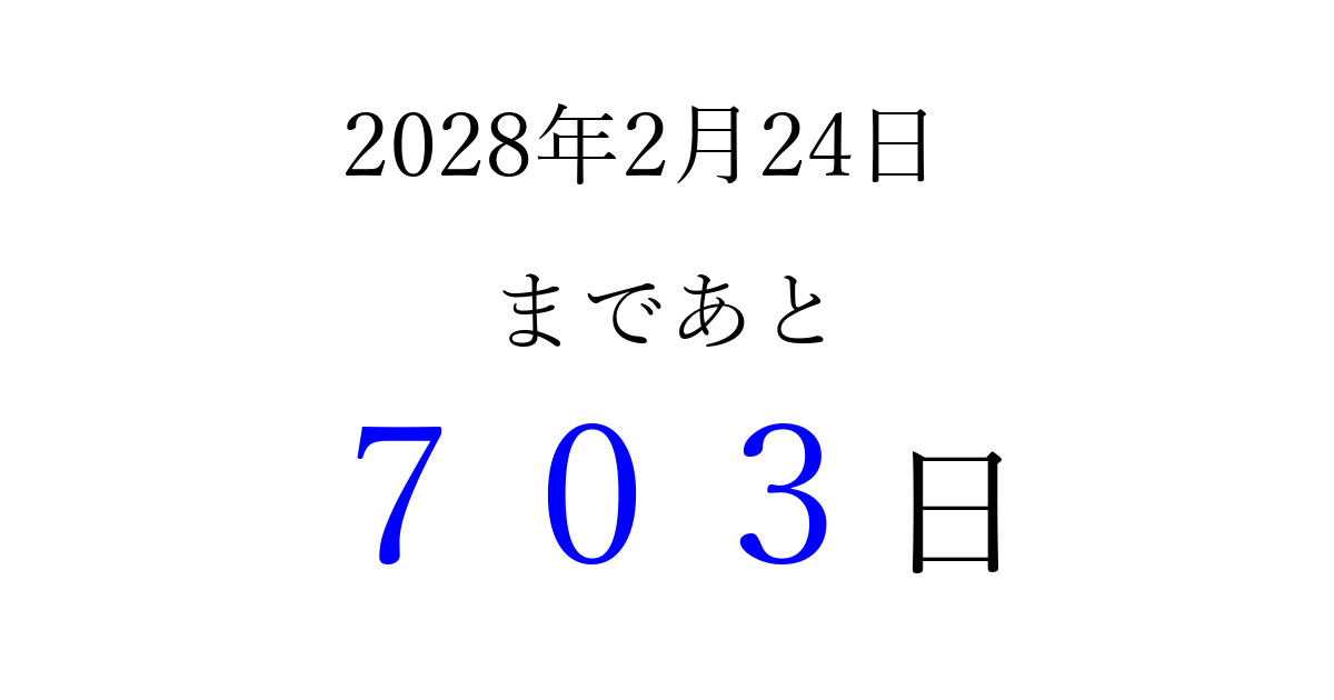 2028年2月24日(木)まで あと 999 日です 追加すると、トップページからすぐ選べるようになります ※2026/03/23現在の結果です。 最新の状態に更新する ↓シェアして、タイムライン上にカウントダウンを表示しよう!↓ 📤 この結果を共有する Tweet シェア Threads Bluesky 別の日付でカウントダウン 2028年2月のカレンダー このページをブックマークに追加すると、いつでもカウントダウンを確認できます。 (PC: Ctrl+D / Mac: ⌘+D) hitome-notes.comでは以下のページも運営しています。 指定日と期間から日付を計算 | ガチャ確率計算・シミュレーション | プライバシー・ポリシー 運営者:Avocado