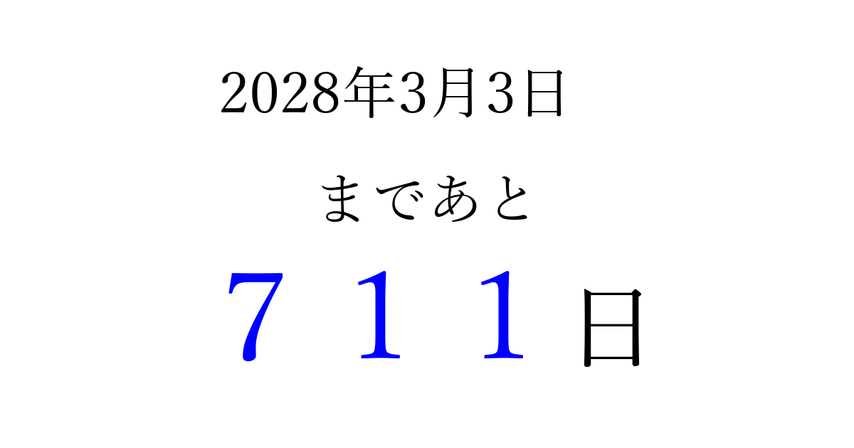 2028年3月3日(金)まで あと 999 日です 追加すると、トップページからすぐ選べるようになります ※2026/03/23現在の結果です。 最新の状態に更新する ↓シェアして、タイムライン上にカウントダウンを表示しよう!↓ 📤 この結果を共有する Tweet シェア Threads Bluesky 別の日付でカウントダウン 2028年3月のカレンダー このページをブックマークに追加すると、いつでもカウントダウンを確認できます。 (PC: Ctrl+D / Mac: ⌘+D) hitome-notes.comでは以下のページも運営しています。 指定日と期間から日付を計算 | ガチャ確率計算・シミュレーション | プライバシー・ポリシー 運営者:Avocado