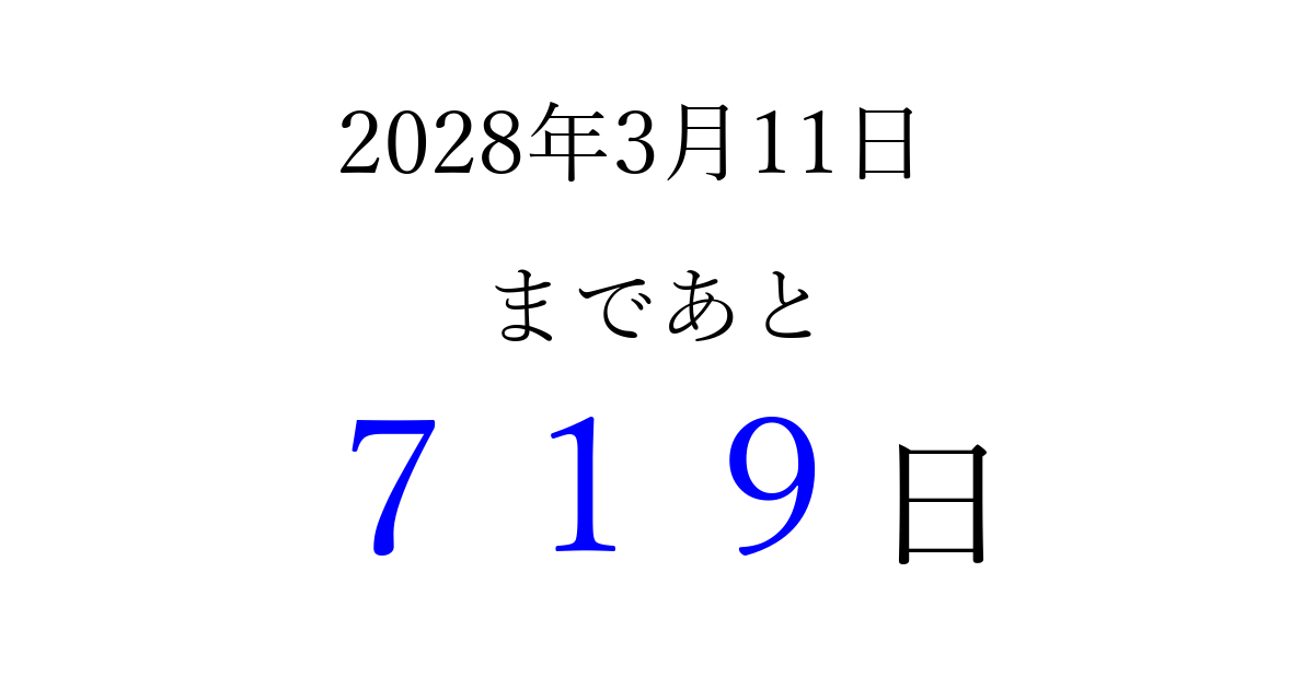 2028年3月11日(土)まで あと 999 日です 追加すると、トップページからすぐ選べるようになります ※2026/03/23現在の結果です。 最新の状態に更新する ↓シェアして、タイムライン上にカウントダウンを表示しよう!↓ 📤 この結果を共有する Tweet シェア Threads Bluesky 別の日付でカウントダウン 2028年3月のカレンダー このページをブックマークに追加すると、いつでもカウントダウンを確認できます。 (PC: Ctrl+D / Mac: ⌘+D) hitome-notes.comでは以下のページも運営しています。 指定日と期間から日付を計算 | ガチャ確率計算・シミュレーション | プライバシー・ポリシー 運営者:Avocado