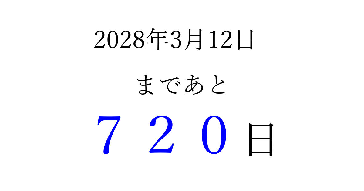 2028年3月12日(日)まで あと 999 日です 追加すると、トップページからすぐ選べるようになります ※2026/03/23現在の結果です。 最新の状態に更新する ↓シェアして、タイムライン上にカウントダウンを表示しよう!↓ 📤 この結果を共有する Tweet シェア Threads Bluesky 別の日付でカウントダウン 2028年3月のカレンダー このページをブックマークに追加すると、いつでもカウントダウンを確認できます。 (PC: Ctrl+D / Mac: ⌘+D) hitome-notes.comでは以下のページも運営しています。 指定日と期間から日付を計算 | ガチャ確率計算・シミュレーション | プライバシー・ポリシー 運営者:Avocado