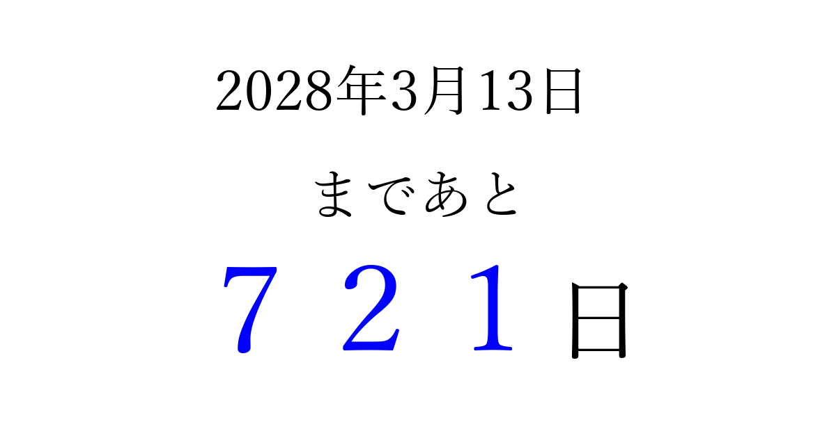 2028年3月13日(月)まで あと 999 日です 追加すると、トップページからすぐ選べるようになります ※2026/03/23現在の結果です。 最新の状態に更新する ↓シェアして、タイムライン上にカウントダウンを表示しよう!↓ 📤 この結果を共有する Tweet シェア Threads Bluesky 別の日付でカウントダウン 2028年3月のカレンダー このページをブックマークに追加すると、いつでもカウントダウンを確認できます。 (PC: Ctrl+D / Mac: ⌘+D) hitome-notes.comでは以下のページも運営しています。 指定日と期間から日付を計算 | ガチャ確率計算・シミュレーション | プライバシー・ポリシー 運営者:Avocado