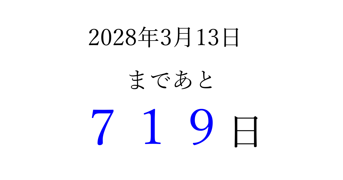 2028年3月13日(月)まで あと 999 日です 追加すると、トップページからすぐ選べるようになります ※2026/03/25現在の結果です。 最新の状態に更新する ↓シェアして、タイムライン上にカウントダウンを表示しよう!↓ 📤 この結果を共有する Tweet シェア Threads Bluesky 別の日付でカウントダウン 2028年3月のカレンダー このページをブックマークに追加すると、いつでもカウントダウンを確認できます。 (PC: Ctrl+D / Mac: ⌘+D) hitome-notes.comでは以下のページも運営しています。 指定日と期間から日付を計算 | ガチャ確率計算・シミュレーション | プライバシー・ポリシー 運営者:Avocado