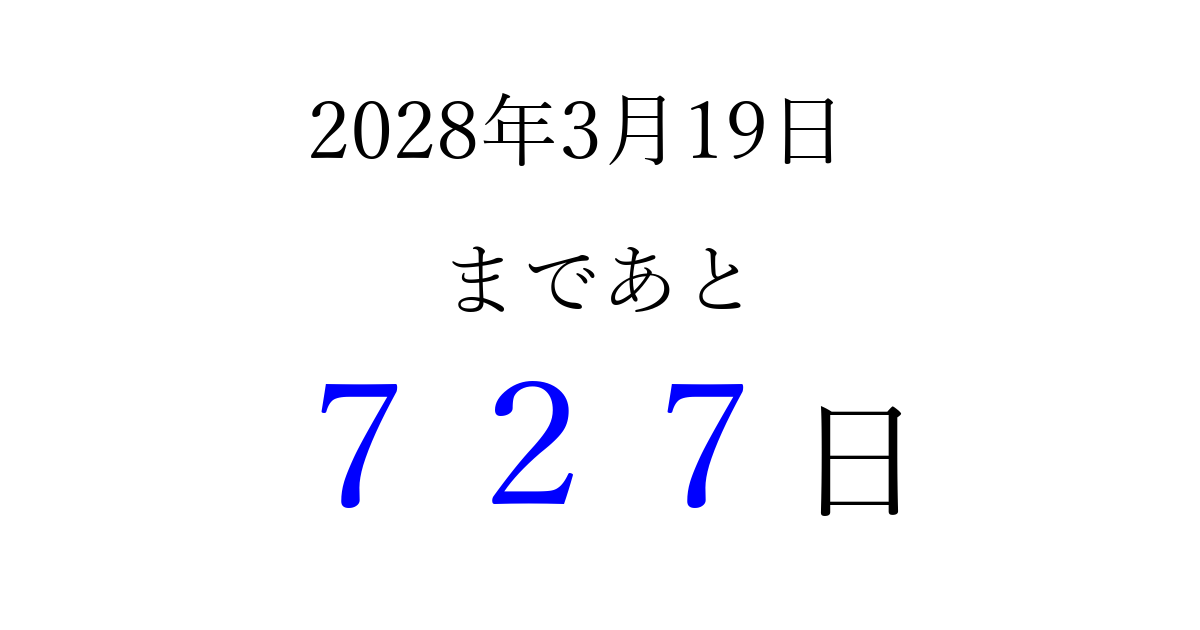 2028年3月19日(日)まで あと 999 日です 追加すると、トップページからすぐ選べるようになります ※2026/03/23現在の結果です。 最新の状態に更新する ↓シェアして、タイムライン上にカウントダウンを表示しよう!↓ 📤 この結果を共有する Tweet シェア Threads Bluesky 別の日付でカウントダウン 2028年3月のカレンダー このページをブックマークに追加すると、いつでもカウントダウンを確認できます。 (PC: Ctrl+D / Mac: ⌘+D) hitome-notes.comでは以下のページも運営しています。 指定日と期間から日付を計算 | ガチャ確率計算・シミュレーション | プライバシー・ポリシー 運営者:Avocado
