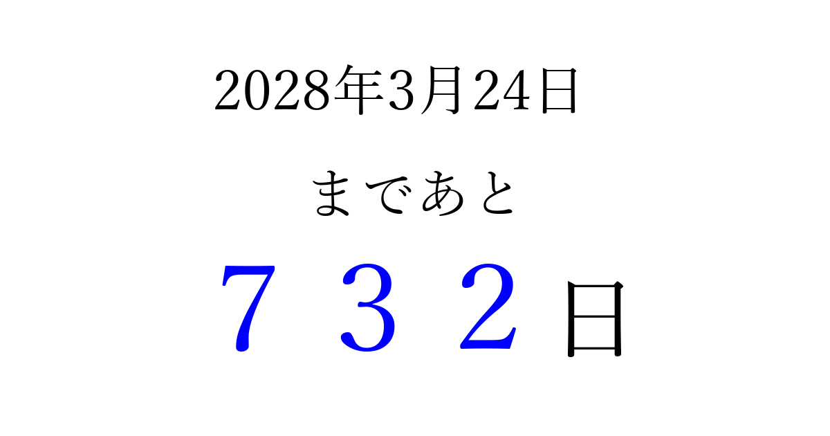 2028年3月24日(金)まで あと 999 日です 追加すると、トップページからすぐ選べるようになります ※2026/03/23現在の結果です。 最新の状態に更新する ↓シェアして、タイムライン上にカウントダウンを表示しよう!↓ 📤 この結果を共有する Tweet シェア Threads Bluesky 別の日付でカウントダウン 2028年3月のカレンダー このページをブックマークに追加すると、いつでもカウントダウンを確認できます。 (PC: Ctrl+D / Mac: ⌘+D) hitome-notes.comでは以下のページも運営しています。 指定日と期間から日付を計算 | ガチャ確率計算・シミュレーション | プライバシー・ポリシー 運営者:Avocado