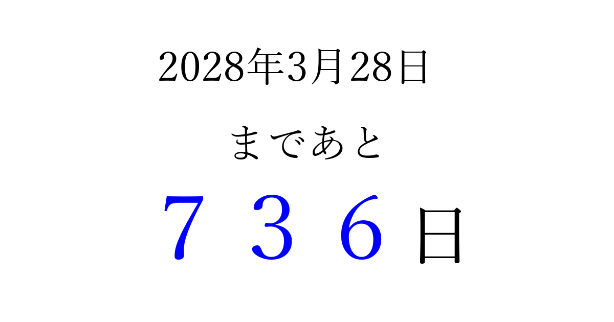 2028年3月28日(火)まで あと 999 日です 追加すると、トップページからすぐ選べるようになります ※2026/03/23現在の結果です。 最新の状態に更新する ↓シェアして、タイムライン上にカウントダウンを表示しよう!↓ 📤 この結果を共有する Tweet シェア Threads Bluesky 別の日付でカウントダウン 2028年3月のカレンダー このページをブックマークに追加すると、いつでもカウントダウンを確認できます。 (PC: Ctrl+D / Mac: ⌘+D) hitome-notes.comでは以下のページも運営しています。 指定日と期間から日付を計算 | ガチャ確率計算・シミュレーション | プライバシー・ポリシー 運営者:Avocado
