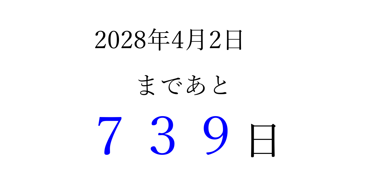 2028年4月2日(日)まで あと 999 日です 追加すると、トップページからすぐ選べるようになります ※2026/03/25現在の結果です。 最新の状態に更新する ↓シェアして、タイムライン上にカウントダウンを表示しよう!↓ 📤 この結果を共有する Tweet シェア Threads Bluesky 別の日付でカウントダウン 2028年4月のカレンダー このページをブックマークに追加すると、いつでもカウントダウンを確認できます。 (PC: Ctrl+D / Mac: ⌘+D) hitome-notes.comでは以下のページも運営しています。 指定日と期間から日付を計算 | ガチャ確率計算・シミュレーション | プライバシー・ポリシー 運営者:Avocado