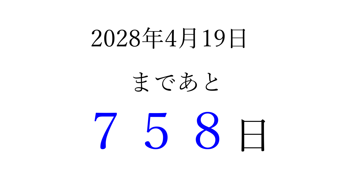 2028年4月19日(水)まで あと 999 日です 追加すると、トップページからすぐ選べるようになります ※2026/03/23現在の結果です。 最新の状態に更新する ↓シェアして、タイムライン上にカウントダウンを表示しよう!↓ 📤 この結果を共有する Tweet シェア Threads Bluesky 別の日付でカウントダウン 2028年4月のカレンダー このページをブックマークに追加すると、いつでもカウントダウンを確認できます。 (PC: Ctrl+D / Mac: ⌘+D) hitome-notes.comでは以下のページも運営しています。 指定日と期間から日付を計算 | ガチャ確率計算・シミュレーション | プライバシー・ポリシー 運営者:Avocado