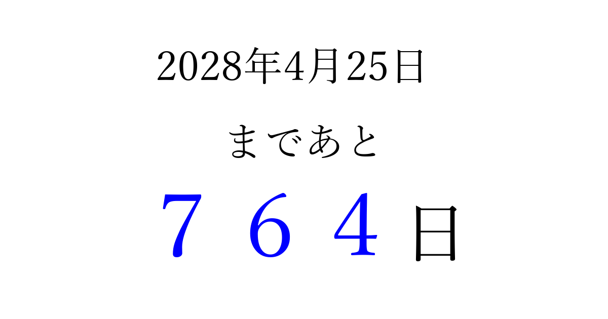 2028年4月25日(火)まで あと 999 日です 追加すると、トップページからすぐ選べるようになります ※2026/03/23現在の結果です。 最新の状態に更新する ↓シェアして、タイムライン上にカウントダウンを表示しよう!↓ 📤 この結果を共有する Tweet シェア Threads Bluesky 別の日付でカウントダウン 2028年4月のカレンダー このページをブックマークに追加すると、いつでもカウントダウンを確認できます。 (PC: Ctrl+D / Mac: ⌘+D) hitome-notes.comでは以下のページも運営しています。 指定日と期間から日付を計算 | ガチャ確率計算・シミュレーション | プライバシー・ポリシー 運営者:Avocado