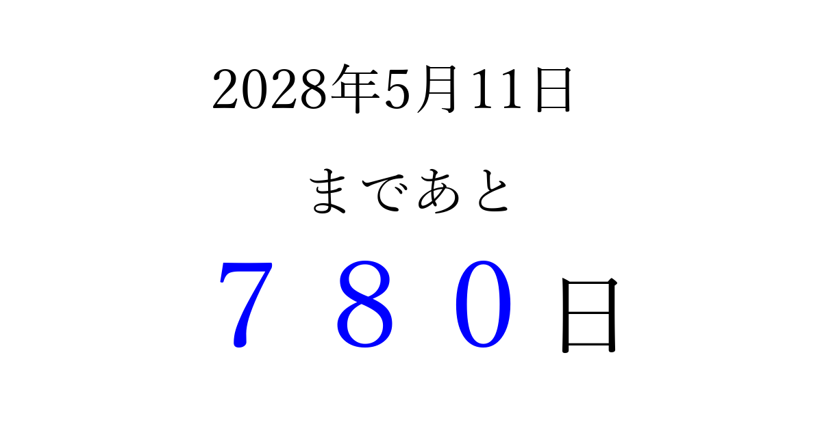 2028年5月11日(木)まで あと 999 日です 追加すると、トップページからすぐ選べるようになります ※2026/03/23現在の結果です。 最新の状態に更新する ↓シェアして、タイムライン上にカウントダウンを表示しよう!↓ 📤 この結果を共有する Tweet シェア Threads Bluesky 別の日付でカウントダウン 2028年5月のカレンダー このページをブックマークに追加すると、いつでもカウントダウンを確認できます。 (PC: Ctrl+D / Mac: ⌘+D) hitome-notes.comでは以下のページも運営しています。 指定日と期間から日付を計算 | ガチャ確率計算・シミュレーション | プライバシー・ポリシー 運営者:Avocado