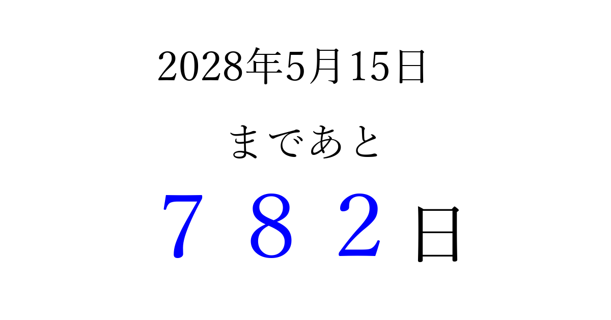 2028年5月15日(月)まで あと 999 日です 追加すると、トップページからすぐ選べるようになります ※2026/03/25現在の結果です。 最新の状態に更新する ↓シェアして、タイムライン上にカウントダウンを表示しよう!↓ 📤 この結果を共有する Tweet シェア Threads Bluesky 別の日付でカウントダウン 2028年5月のカレンダー このページをブックマークに追加すると、いつでもカウントダウンを確認できます。 (PC: Ctrl+D / Mac: ⌘+D) hitome-notes.comでは以下のページも運営しています。 指定日と期間から日付を計算 | ガチャ確率計算・シミュレーション | プライバシー・ポリシー 運営者:Avocado