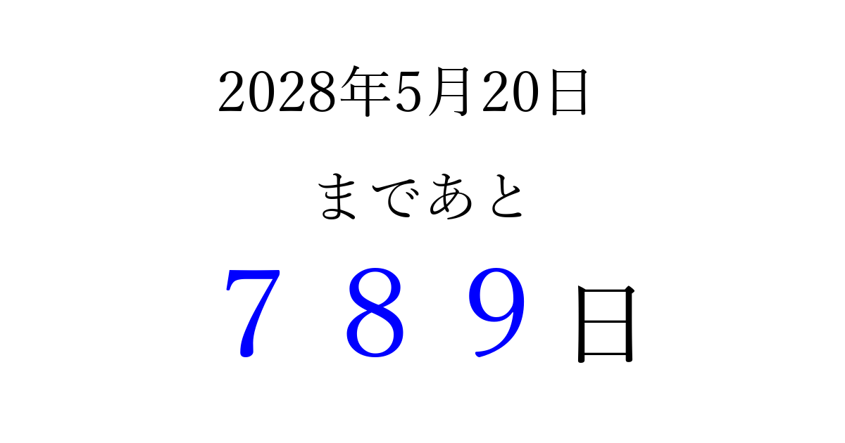 2028年5月20日(土)まで あと 999 日です 追加すると、トップページからすぐ選べるようになります ※2026/03/23現在の結果です。 最新の状態に更新する ↓シェアして、タイムライン上にカウントダウンを表示しよう!↓ 📤 この結果を共有する Tweet シェア Threads Bluesky 別の日付でカウントダウン 2028年5月のカレンダー このページをブックマークに追加すると、いつでもカウントダウンを確認できます。 (PC: Ctrl+D / Mac: ⌘+D) hitome-notes.comでは以下のページも運営しています。 指定日と期間から日付を計算 | ガチャ確率計算・シミュレーション | プライバシー・ポリシー 運営者:Avocado