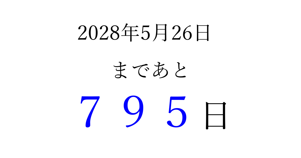2028年5月26日(金)まで あと 999 日です 追加すると、トップページからすぐ選べるようになります ※2026/03/23現在の結果です。 最新の状態に更新する ↓シェアして、タイムライン上にカウントダウンを表示しよう!↓ 📤 この結果を共有する Tweet シェア Threads Bluesky 別の日付でカウントダウン 2028年5月のカレンダー このページをブックマークに追加すると、いつでもカウントダウンを確認できます。 (PC: Ctrl+D / Mac: ⌘+D) hitome-notes.comでは以下のページも運営しています。 指定日と期間から日付を計算 | ガチャ確率計算・シミュレーション | プライバシー・ポリシー 運営者:Avocado