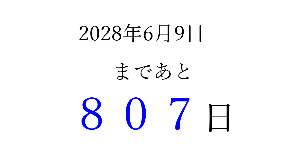 2028年6月9日(金)まで あと 999 日です 追加すると、トップページからすぐ選べるようになります ※2026/03/25現在の結果です。 最新の状態に更新する ↓シェアして、タイムライン上にカウントダウンを表示しよう!↓ 📤 この結果を共有する Tweet シェア Threads Bluesky 別の日付でカウントダウン 2028年6月のカレンダー このページをブックマークに追加すると、いつでもカウントダウンを確認できます。 (PC: Ctrl+D / Mac: ⌘+D) hitome-notes.comでは以下のページも運営しています。 指定日と期間から日付を計算 | ガチャ確率計算・シミュレーション | プライバシー・ポリシー 運営者:Avocado
