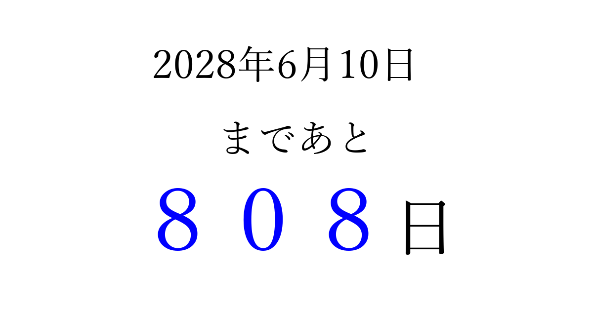 2028年6月10日(土)まで あと 999 日です 追加すると、トップページからすぐ選べるようになります ※2026/03/25現在の結果です。 最新の状態に更新する ↓シェアして、タイムライン上にカウントダウンを表示しよう!↓ 📤 この結果を共有する Tweet シェア Threads Bluesky 別の日付でカウントダウン 2028年6月のカレンダー このページをブックマークに追加すると、いつでもカウントダウンを確認できます。 (PC: Ctrl+D / Mac: ⌘+D) hitome-notes.comでは以下のページも運営しています。 指定日と期間から日付を計算 | ガチャ確率計算・シミュレーション | プライバシー・ポリシー 運営者:Avocado