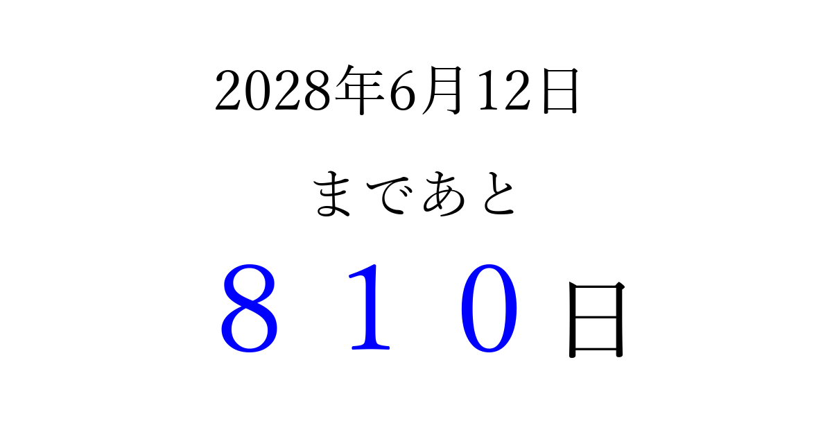 2028年6月12日(月)まで あと 999 日です 追加すると、トップページからすぐ選べるようになります ※2026/03/25現在の結果です。 最新の状態に更新する ↓シェアして、タイムライン上にカウントダウンを表示しよう!↓ 📤 この結果を共有する Tweet シェア Threads Bluesky 別の日付でカウントダウン 2028年6月のカレンダー このページをブックマークに追加すると、いつでもカウントダウンを確認できます。 (PC: Ctrl+D / Mac: ⌘+D) hitome-notes.comでは以下のページも運営しています。 指定日と期間から日付を計算 | ガチャ確率計算・シミュレーション | プライバシー・ポリシー 運営者:Avocado
