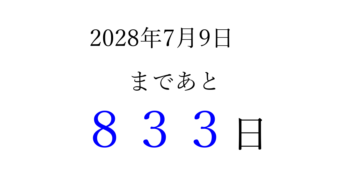 2028年7月9日(日)まで あと 999 日です 追加すると、トップページからすぐ選べるようになります ※2026/03/29現在の結果です。 最新の状態に更新する ↓シェアして、タイムライン上にカウントダウンを表示しよう!↓ 📤 この結果を共有する Tweet シェア Threads Bluesky 別の日付でカウントダウン 2028年7月のカレンダー このページをブックマークに追加すると、いつでもカウントダウンを確認できます。 (PC: Ctrl+D / Mac: ⌘+D) hitome-notes.comでは以下のページも運営しています。 指定日と期間から日付を計算 | ガチャ確率計算・シミュレーション | プライバシー・ポリシー 運営者:Avocado