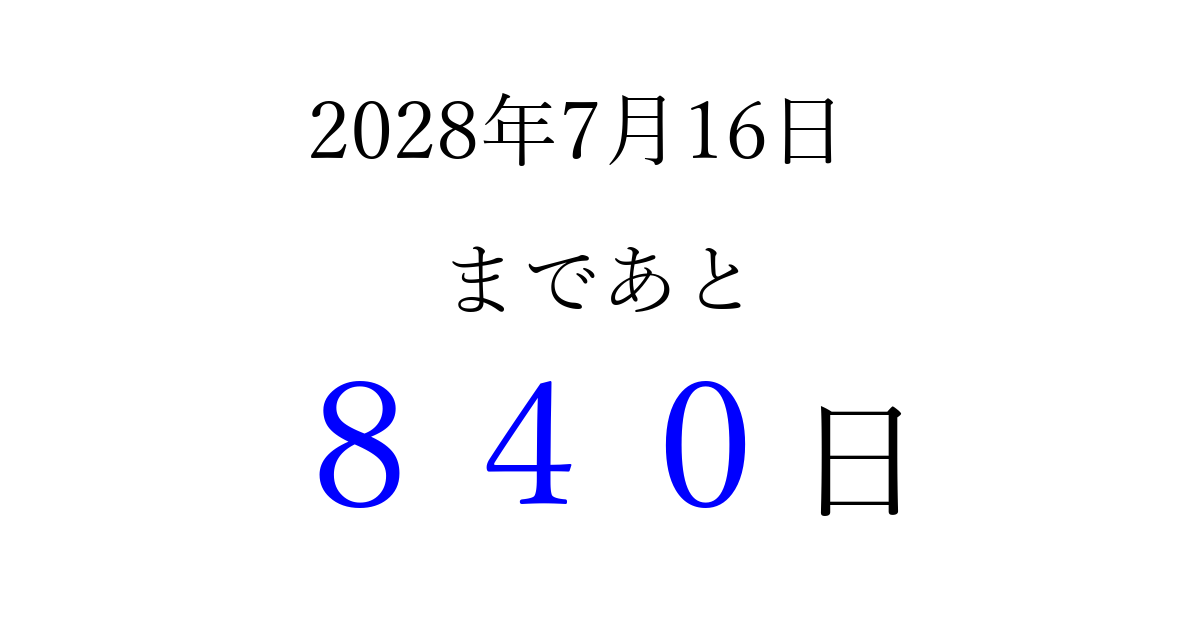 2028年7月16日(日)まで あと 999 日です 追加すると、トップページからすぐ選べるようになります ※2026/03/29現在の結果です。 最新の状態に更新する ↓シェアして、タイムライン上にカウントダウンを表示しよう!↓ 📤 この結果を共有する Tweet シェア Threads Bluesky 別の日付でカウントダウン 2028年7月のカレンダー このページをブックマークに追加すると、いつでもカウントダウンを確認できます。 (PC: Ctrl+D / Mac: ⌘+D) hitome-notes.comでは以下のページも運営しています。 指定日と期間から日付を計算 | ガチャ確率計算・シミュレーション | プライバシー・ポリシー 運営者:Avocado