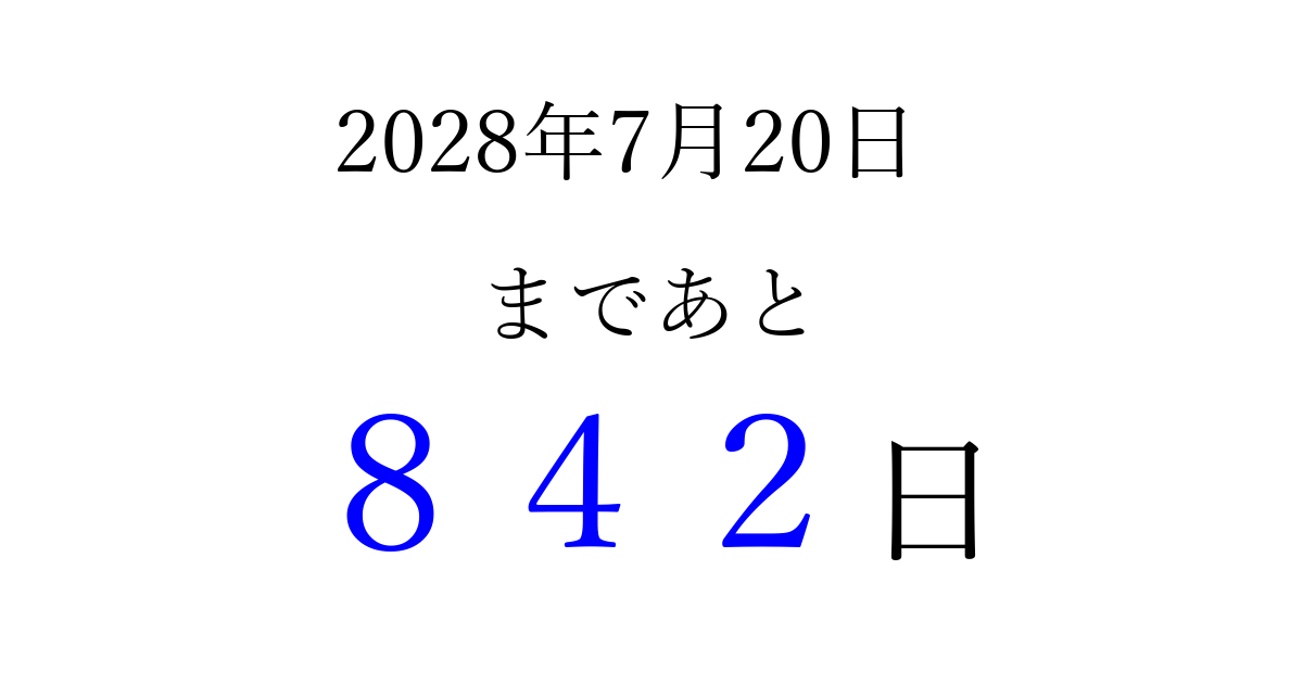 2028年7月20日(木)まで あと 999 日です 追加すると、トップページからすぐ選べるようになります ※2026/03/31現在の結果です。 最新の状態に更新する ↓シェアして、タイムライン上にカウントダウンを表示しよう!↓ 📤 この結果を共有する Tweet シェア Threads Bluesky 別の日付でカウントダウン 2028年7月のカレンダー このページをブックマークに追加すると、いつでもカウントダウンを確認できます。 (PC: Ctrl+D / Mac: ⌘+D) hitome-notes.comでは以下のページも運営しています。 指定日と期間から日付を計算 | ガチャ確率計算・シミュレーション | プライバシー・ポリシー 運営者:Avocado