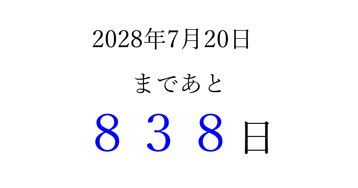 2028年7月20日(木)まで あと 999 日です 追加すると、トップページからすぐ選べるようになります ※2026/04/04現在の結果です。 最新の状態に更新する ↓シェアして、タイムライン上にカウントダウンを表示しよう!↓ 📤 この結果を共有する Tweet シェア Threads Bluesky 別の日付でカウントダウン 2028年7月のカレンダー このページをブックマークに追加すると、いつでもカウントダウンを確認できます。 (PC: Ctrl+D / Mac: ⌘+D) hitome-notes.comでは以下のページも運営しています。 指定日と期間から日付を計算 | ガチャ確率計算・シミュレーション | プライバシー・ポリシー 運営者:Avocado