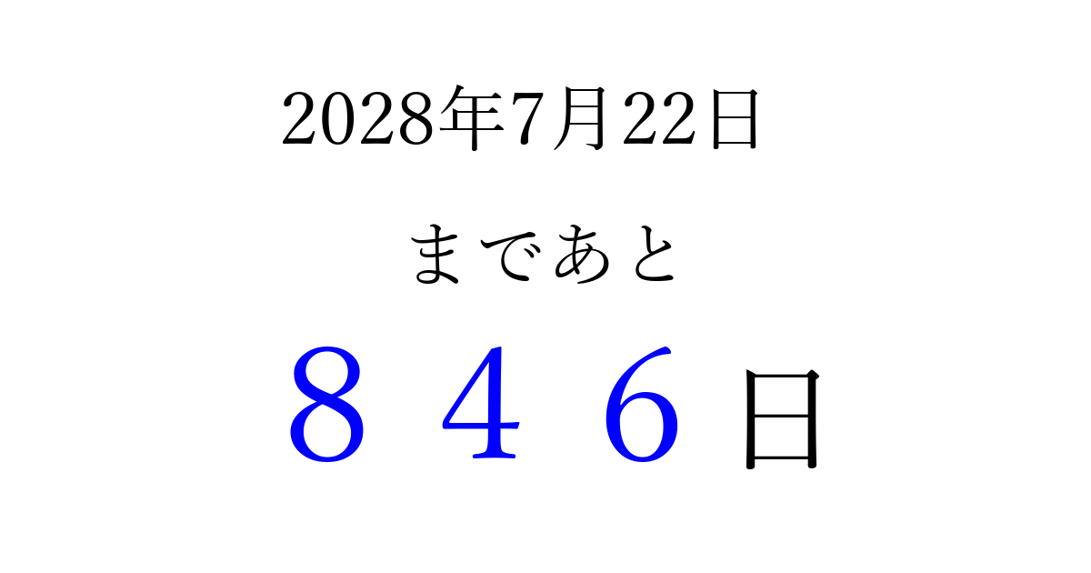 2028年7月22日(土)まで あと 999 日です 追加すると、トップページからすぐ選べるようになります ※2026/03/29現在の結果です。 最新の状態に更新する ↓シェアして、タイムライン上にカウントダウンを表示しよう!↓ 📤 この結果を共有する Tweet シェア Threads Bluesky 別の日付でカウントダウン 2028年7月のカレンダー このページをブックマークに追加すると、いつでもカウントダウンを確認できます。 (PC: Ctrl+D / Mac: ⌘+D) hitome-notes.comでは以下のページも運営しています。 指定日と期間から日付を計算 | ガチャ確率計算・シミュレーション | プライバシー・ポリシー 運営者:Avocado