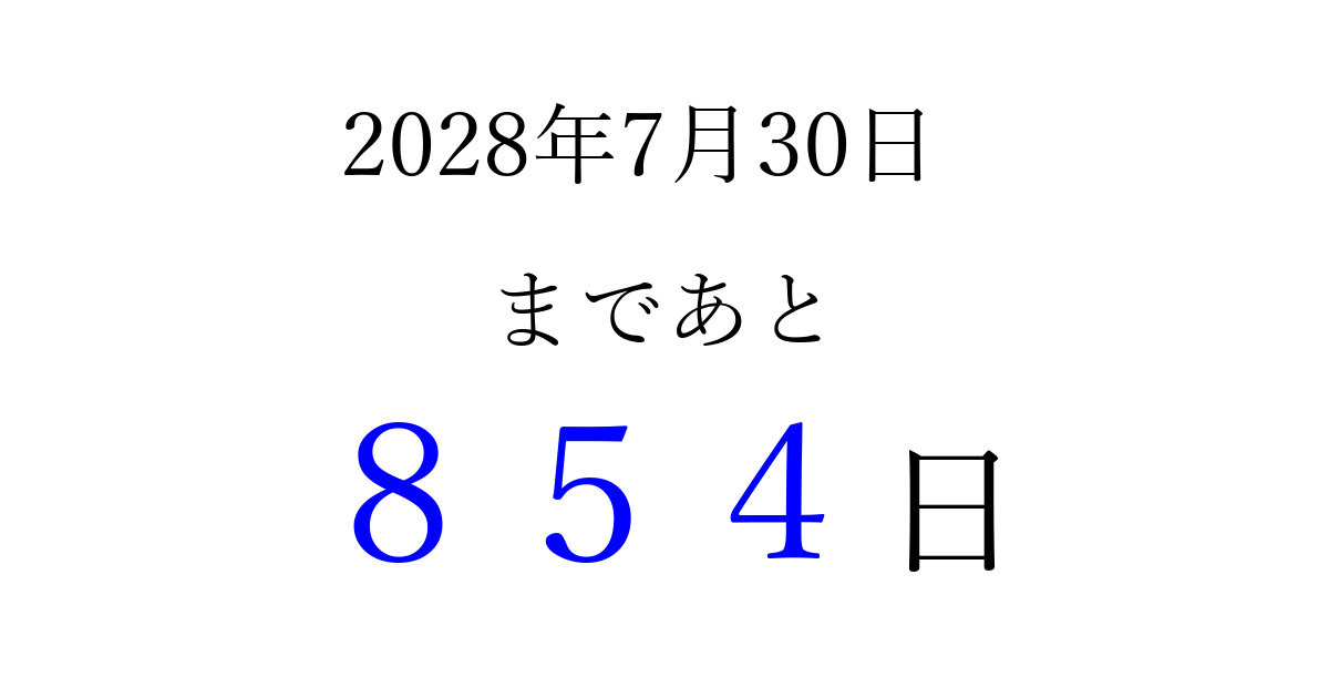 2028年7月30日(日)まで あと 999 日です 追加すると、トップページからすぐ選べるようになります ※2026/03/29現在の結果です。 最新の状態に更新する ↓シェアして、タイムライン上にカウントダウンを表示しよう!↓ 📤 この結果を共有する Tweet シェア Threads Bluesky 別の日付でカウントダウン 2028年7月のカレンダー このページをブックマークに追加すると、いつでもカウントダウンを確認できます。 (PC: Ctrl+D / Mac: ⌘+D) hitome-notes.comでは以下のページも運営しています。 指定日と期間から日付を計算 | ガチャ確率計算・シミュレーション | プライバシー・ポリシー 運営者:Avocado