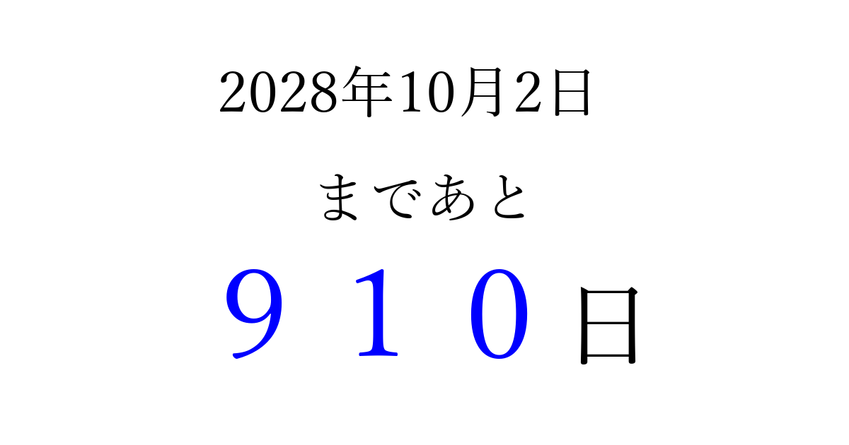 2028年10月2日(月)まで あと 999 日です 追加すると、トップページからすぐ選べるようになります ※2026/04/06現在の結果です。 最新の状態に更新する ↓シェアして、タイムライン上にカウントダウンを表示しよう!↓ 📤 この結果を共有する Tweet シェア Threads Bluesky 別の日付でカウントダウン 2028年10月のカレンダー このページをブックマークに追加すると、いつでもカウントダウンを確認できます。 (PC: Ctrl+D / Mac: ⌘+D) hitome-notes.comでは以下のページも運営しています。 指定日と期間から日付を計算 | ガチャ確率計算・シミュレーション | プライバシー・ポリシー 運営者:Avocado