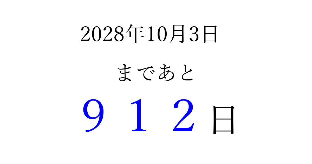 2028年10月3日(火)まで あと 999 日です 追加すると、トップページからすぐ選べるようになります ※2026/04/05現在の結果です。 最新の状態に更新する ↓シェアして、タイムライン上にカウントダウンを表示しよう!↓ 📤 この結果を共有する Tweet シェア Threads Bluesky 別の日付でカウントダウン 2028年10月のカレンダー このページをブックマークに追加すると、いつでもカウントダウンを確認できます。 (PC: Ctrl+D / Mac: ⌘+D) hitome-notes.comでは以下のページも運営しています。 指定日と期間から日付を計算 | ガチャ確率計算・シミュレーション | プライバシー・ポリシー 運営者:Avocado