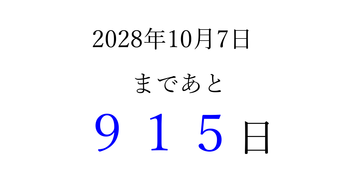2028年10月7日(土)まで あと 999 日です 追加すると、トップページからすぐ選べるようになります ※2026/04/06現在の結果です。 最新の状態に更新する ↓シェアして、タイムライン上にカウントダウンを表示しよう!↓ 📤 この結果を共有する Tweet シェア Threads Bluesky 別の日付でカウントダウン 2028年10月のカレンダー このページをブックマークに追加すると、いつでもカウントダウンを確認できます。 (PC: Ctrl+D / Mac: ⌘+D) hitome-notes.comでは以下のページも運営しています。 指定日と期間から日付を計算 | ガチャ確率計算・シミュレーション | プライバシー・ポリシー 運営者:Avocado