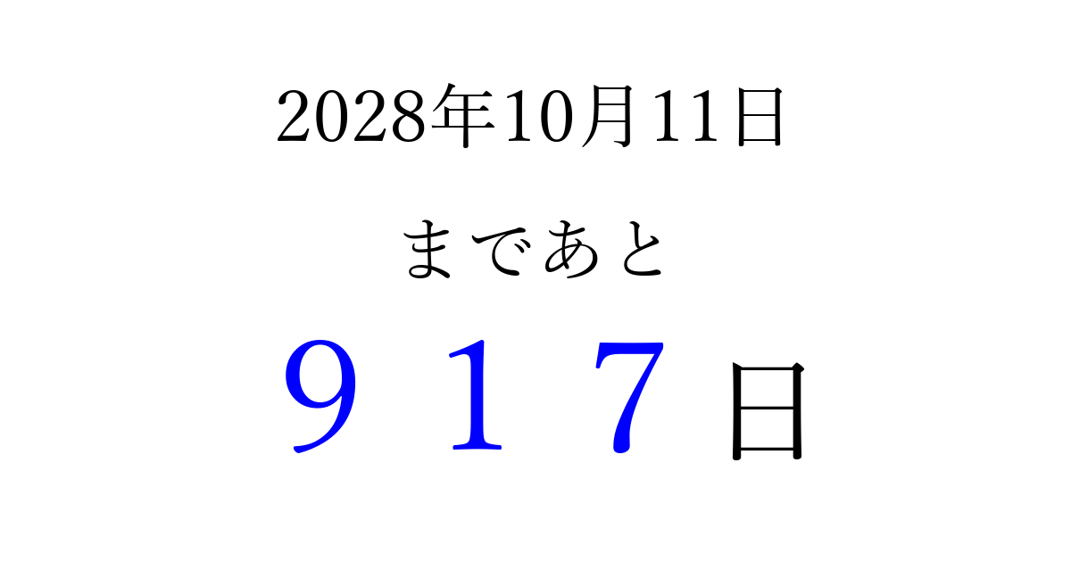2028年10月11日(水)まで あと 999 日です 追加すると、トップページからすぐ選べるようになります ※2026/04/08現在の結果です。 最新の状態に更新する ↓シェアして、タイムライン上にカウントダウンを表示しよう!↓ 📤 この結果を共有する Tweet シェア Threads Bluesky 別の日付でカウントダウン 2028年10月のカレンダー このページをブックマークに追加すると、いつでもカウントダウンを確認できます。 (PC: Ctrl+D / Mac: ⌘+D) hitome-notes.comでは以下のページも運営しています。 指定日と期間から日付を計算 | ガチャ確率計算・シミュレーション | プライバシー・ポリシー 運営者:Avocado