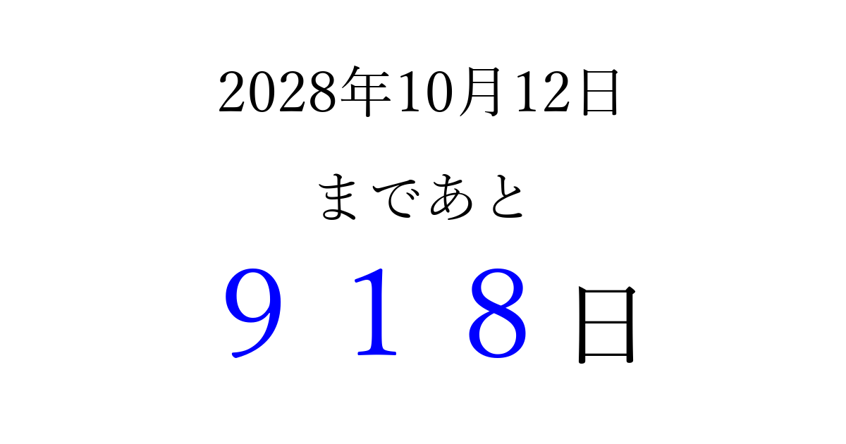 2028年10月12日(木)まで あと 999 日です 追加すると、トップページからすぐ選べるようになります ※2026/04/08現在の結果です。 最新の状態に更新する ↓シェアして、タイムライン上にカウントダウンを表示しよう!↓ 📤 この結果を共有する Tweet シェア Threads Bluesky 別の日付でカウントダウン 2028年10月のカレンダー このページをブックマークに追加すると、いつでもカウントダウンを確認できます。 (PC: Ctrl+D / Mac: ⌘+D) hitome-notes.comでは以下のページも運営しています。 指定日と期間から日付を計算 | ガチャ確率計算・シミュレーション | プライバシー・ポリシー 運営者:Avocado