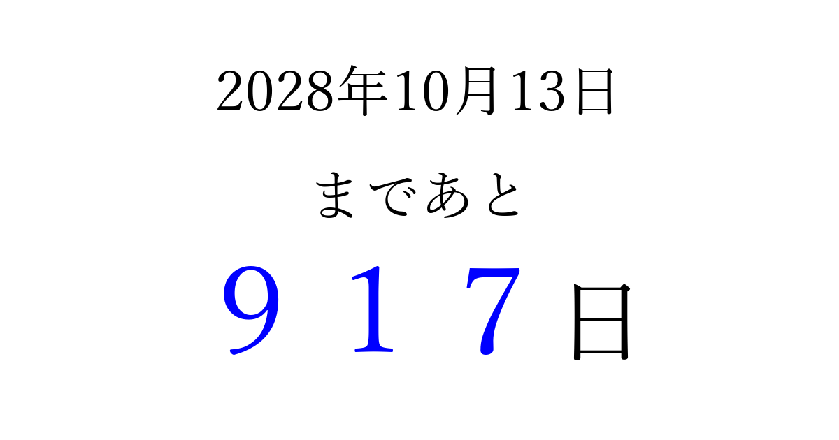 2028年10月13日(金)まで あと 999 日です 追加すると、トップページからすぐ選べるようになります ※2026/04/10現在の結果です。 最新の状態に更新する ↓シェアして、タイムライン上にカウントダウンを表示しよう!↓ 📤 この結果を共有する Tweet シェア Threads Bluesky 別の日付でカウントダウン 2028年10月のカレンダー このページをブックマークに追加すると、いつでもカウントダウンを確認できます。 (PC: Ctrl+D / Mac: ⌘+D) hitome-notes.comでは以下のページも運営しています。 指定日と期間から日付を計算 | ガチャ確率計算・シミュレーション | プライバシー・ポリシー 運営者:Avocado