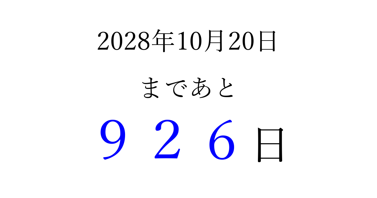 2028年10月20日(金)まで あと 999 日です 追加すると、トップページからすぐ選べるようになります ※2026/04/08現在の結果です。 最新の状態に更新する ↓シェアして、タイムライン上にカウントダウンを表示しよう!↓ 📤 この結果を共有する Tweet シェア Threads Bluesky 別の日付でカウントダウン 2028年10月のカレンダー このページをブックマークに追加すると、いつでもカウントダウンを確認できます。 (PC: Ctrl+D / Mac: ⌘+D) hitome-notes.comでは以下のページも運営しています。 指定日と期間から日付を計算 | ガチャ確率計算・シミュレーション | プライバシー・ポリシー 運営者:Avocado