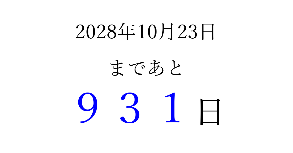 2028年10月23日(月)まで あと 999 日です 追加すると、トップページからすぐ選べるようになります ※2026/04/06現在の結果です。 最新の状態に更新する ↓シェアして、タイムライン上にカウントダウンを表示しよう!↓ 📤 この結果を共有する Tweet シェア Threads Bluesky 別の日付でカウントダウン 2028年10月のカレンダー このページをブックマークに追加すると、いつでもカウントダウンを確認できます。 (PC: Ctrl+D / Mac: ⌘+D) hitome-notes.comでは以下のページも運営しています。 指定日と期間から日付を計算 | ガチャ確率計算・シミュレーション | プライバシー・ポリシー 運営者:Avocado