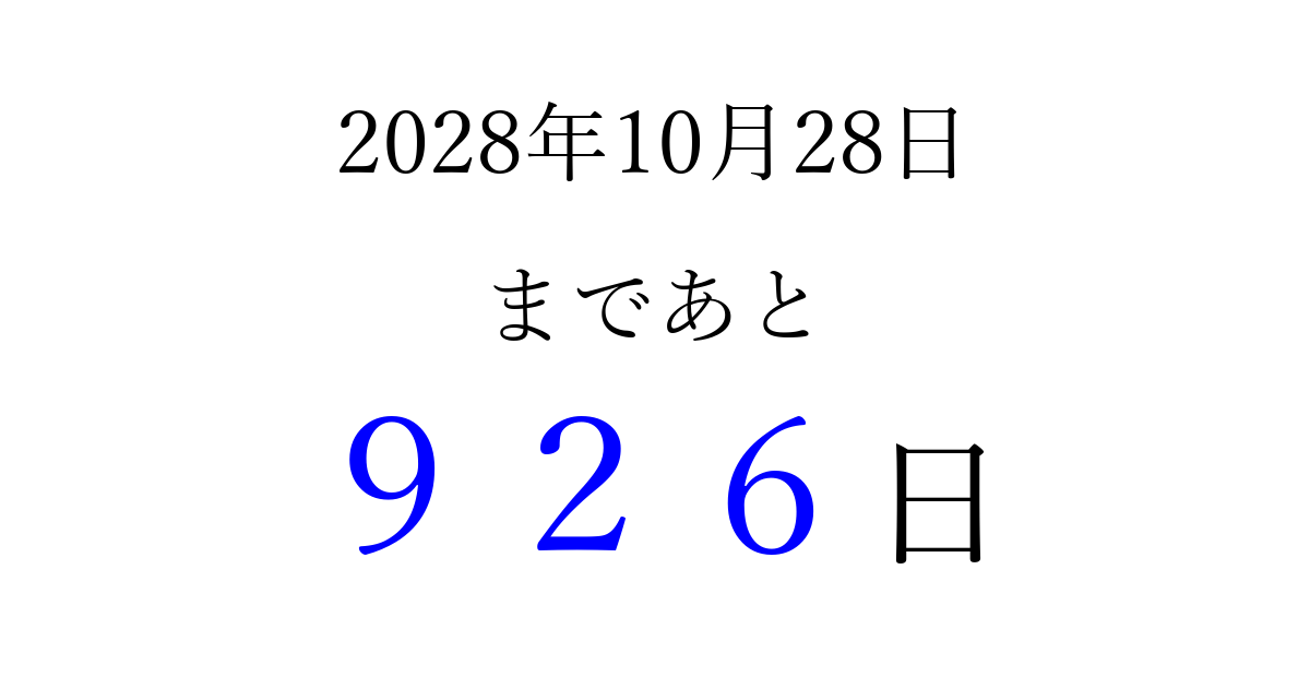 2028年10月28日(土)まで あと 999 日です 追加すると、トップページからすぐ選べるようになります ※2026/04/16現在の結果です。 最新の状態に更新する ↓シェアして、タイムライン上にカウントダウンを表示しよう!↓ 📤 この結果を共有する Tweet シェア Threads Bluesky 別の日付でカウントダウン 2028年10月のカレンダー このページをブックマークに追加すると、いつでもカウントダウンを確認できます。 (PC: Ctrl+D / Mac: ⌘+D) hitome-notes.comでは以下のページも運営しています。 指定日と期間から日付を計算 | ガチャ確率計算・シミュレーション | プライバシー・ポリシー 運営者:Avocado
