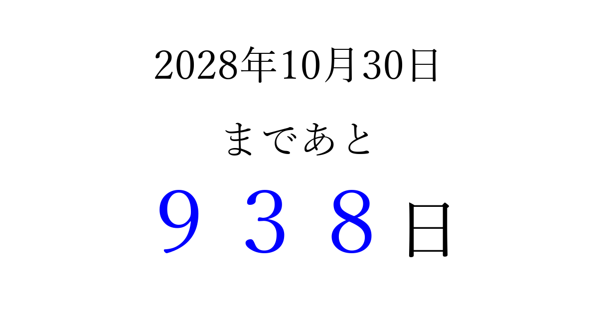2028年10月30日(月)まで あと 999 日です 追加すると、トップページからすぐ選べるようになります ※2026/04/06現在の結果です。 最新の状態に更新する ↓シェアして、タイムライン上にカウントダウンを表示しよう!↓ 📤 この結果を共有する Tweet シェア Threads Bluesky 別の日付でカウントダウン 2028年10月のカレンダー このページをブックマークに追加すると、いつでもカウントダウンを確認できます。 (PC: Ctrl+D / Mac: ⌘+D) hitome-notes.comでは以下のページも運営しています。 指定日と期間から日付を計算 | ガチャ確率計算・シミュレーション | プライバシー・ポリシー 運営者:Avocado