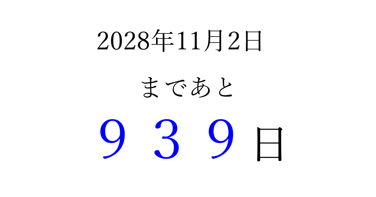 2028年11月2日(木)まで あと 999 日です 追加すると、トップページからすぐ選べるようになります ※2026/04/08現在の結果です。 最新の状態に更新する ↓シェアして、タイムライン上にカウントダウンを表示しよう!↓ 📤 この結果を共有する Tweet シェア Threads Bluesky 別の日付でカウントダウン 2028年11月のカレンダー このページをブックマークに追加すると、いつでもカウントダウンを確認できます。 (PC: Ctrl+D / Mac: ⌘+D) hitome-notes.comでは以下のページも運営しています。 指定日と期間から日付を計算 | ガチャ確率計算・シミュレーション | プライバシー・ポリシー 運営者:Avocado