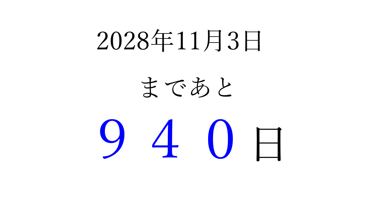 2028年11月3日(金)まで あと 999 日です 追加すると、トップページからすぐ選べるようになります ※2026/04/08現在の結果です。 最新の状態に更新する ↓シェアして、タイムライン上にカウントダウンを表示しよう!↓ 📤 この結果を共有する Tweet シェア Threads Bluesky 別の日付でカウントダウン 2028年11月のカレンダー このページをブックマークに追加すると、いつでもカウントダウンを確認できます。 (PC: Ctrl+D / Mac: ⌘+D) hitome-notes.comでは以下のページも運営しています。 指定日と期間から日付を計算 | ガチャ確率計算・シミュレーション | プライバシー・ポリシー 運営者:Avocado