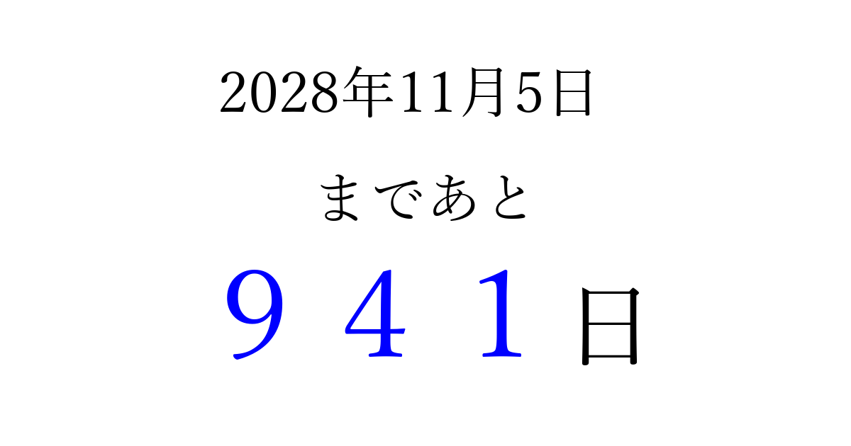 2028年11月5日(日)まで あと 999 日です 追加すると、トップページからすぐ選べるようになります ※2026/04/09現在の結果です。 最新の状態に更新する ↓シェアして、タイムライン上にカウントダウンを表示しよう!↓ 📤 この結果を共有する Tweet シェア Threads Bluesky 別の日付でカウントダウン 2028年11月のカレンダー このページをブックマークに追加すると、いつでもカウントダウンを確認できます。 (PC: Ctrl+D / Mac: ⌘+D) hitome-notes.comでは以下のページも運営しています。 指定日と期間から日付を計算 | ガチャ確率計算・シミュレーション | プライバシー・ポリシー 運営者:Avocado