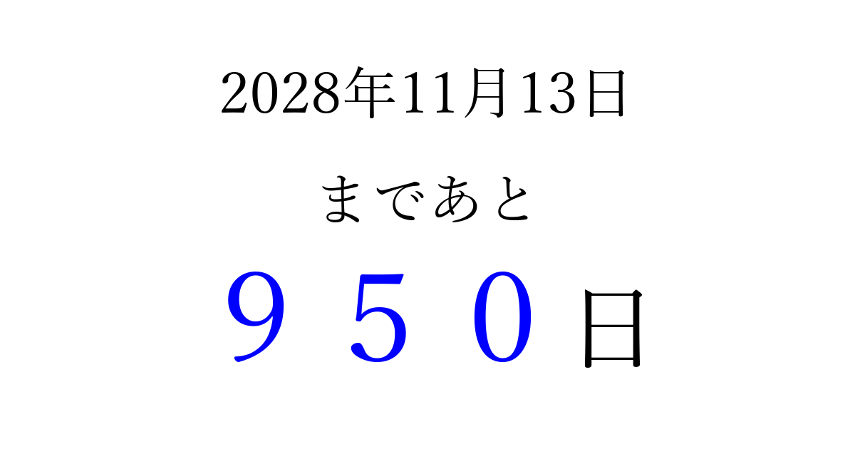 2028年11月13日(月)まで あと 999 日です 追加すると、トップページからすぐ選べるようになります ※2026/04/08現在の結果です。 最新の状態に更新する ↓シェアして、タイムライン上にカウントダウンを表示しよう!↓ 📤 この結果を共有する Tweet シェア Threads Bluesky 別の日付でカウントダウン 2028年11月のカレンダー このページをブックマークに追加すると、いつでもカウントダウンを確認できます。 (PC: Ctrl+D / Mac: ⌘+D) hitome-notes.comでは以下のページも運営しています。 指定日と期間から日付を計算 | ガチャ確率計算・シミュレーション | プライバシー・ポリシー 運営者:Avocado