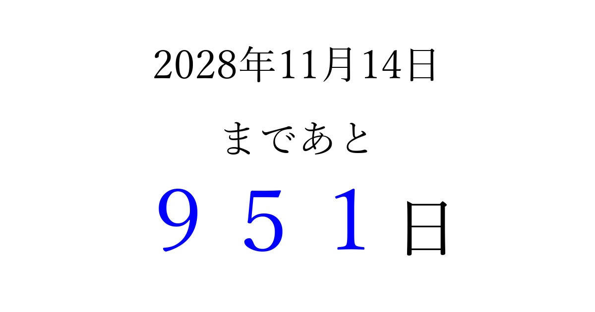 2028年11月14日(火)まで あと 999 日です 追加すると、トップページからすぐ選べるようになります ※2026/04/08現在の結果です。 最新の状態に更新する ↓シェアして、タイムライン上にカウントダウンを表示しよう!↓ 📤 この結果を共有する Tweet シェア Threads Bluesky 別の日付でカウントダウン 2028年11月のカレンダー このページをブックマークに追加すると、いつでもカウントダウンを確認できます。 (PC: Ctrl+D / Mac: ⌘+D) hitome-notes.comでは以下のページも運営しています。 指定日と期間から日付を計算 | ガチャ確率計算・シミュレーション | プライバシー・ポリシー 運営者:Avocado