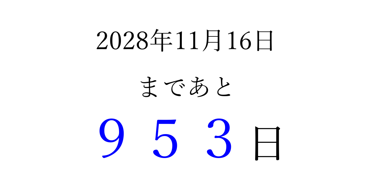 2028年11月16日(木)まで あと 999 日です 追加すると、トップページからすぐ選べるようになります ※2026/04/08現在の結果です。 最新の状態に更新する ↓シェアして、タイムライン上にカウントダウンを表示しよう!↓ 📤 この結果を共有する Tweet シェア Threads Bluesky 別の日付でカウントダウン 2028年11月のカレンダー このページをブックマークに追加すると、いつでもカウントダウンを確認できます。 (PC: Ctrl+D / Mac: ⌘+D) hitome-notes.comでは以下のページも運営しています。 指定日と期間から日付を計算 | ガチャ確率計算・シミュレーション | プライバシー・ポリシー 運営者:Avocado