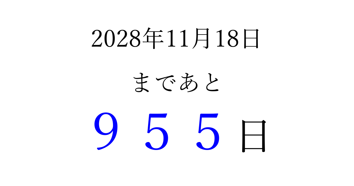 2028年11月18日(土)まで あと 999 日です 追加すると、トップページからすぐ選べるようになります ※2026/04/08現在の結果です。 最新の状態に更新する ↓シェアして、タイムライン上にカウントダウンを表示しよう!↓ 📤 この結果を共有する Tweet シェア Threads Bluesky 別の日付でカウントダウン 2028年11月のカレンダー このページをブックマークに追加すると、いつでもカウントダウンを確認できます。 (PC: Ctrl+D / Mac: ⌘+D) hitome-notes.comでは以下のページも運営しています。 指定日と期間から日付を計算 | ガチャ確率計算・シミュレーション | プライバシー・ポリシー 運営者:Avocado