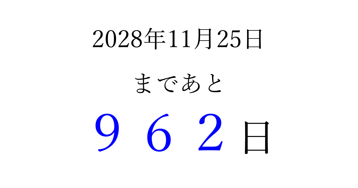2028年11月25日(土)まで あと 999 日です 追加すると、トップページからすぐ選べるようになります ※2026/04/08現在の結果です。 最新の状態に更新する ↓シェアして、タイムライン上にカウントダウンを表示しよう!↓ 📤 この結果を共有する Tweet シェア Threads Bluesky 別の日付でカウントダウン 2028年11月のカレンダー このページをブックマークに追加すると、いつでもカウントダウンを確認できます。 (PC: Ctrl+D / Mac: ⌘+D) hitome-notes.comでは以下のページも運営しています。 指定日と期間から日付を計算 | ガチャ確率計算・シミュレーション | プライバシー・ポリシー 運営者:Avocado