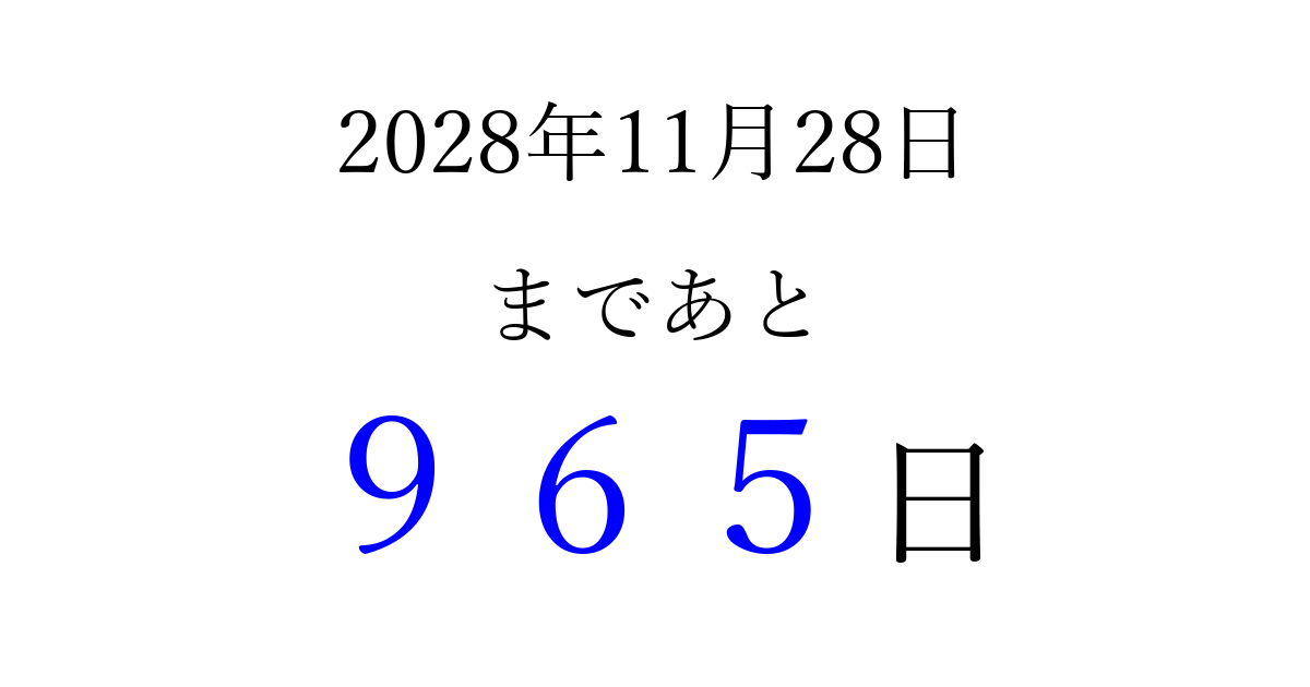 2028年11月28日(火)まで あと 999 日です 追加すると、トップページからすぐ選べるようになります ※2026/04/08現在の結果です。 最新の状態に更新する ↓シェアして、タイムライン上にカウントダウンを表示しよう!↓ 📤 この結果を共有する Tweet シェア Threads Bluesky 別の日付でカウントダウン 2028年11月のカレンダー このページをブックマークに追加すると、いつでもカウントダウンを確認できます。 (PC: Ctrl+D / Mac: ⌘+D) hitome-notes.comでは以下のページも運営しています。 指定日と期間から日付を計算 | ガチャ確率計算・シミュレーション | プライバシー・ポリシー 運営者:Avocado