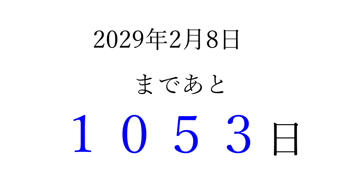 2029年2月8日(木)まで あと 9999 日です 追加すると、トップページからすぐ選べるようになります ※2026/03/23現在の結果です。 最新の状態に更新する ↓シェアして、タイムライン上にカウントダウンを表示しよう!↓ 📤 この結果を共有する Tweet シェア Threads Bluesky 別の日付でカウントダウン 2029年2月のカレンダー このページをブックマークに追加すると、いつでもカウントダウンを確認できます。 (PC: Ctrl+D / Mac: ⌘+D) hitome-notes.comでは以下のページも運営しています。 指定日と期間から日付を計算 | ガチャ確率計算・シミュレーション | プライバシー・ポリシー 運営者:Avocado