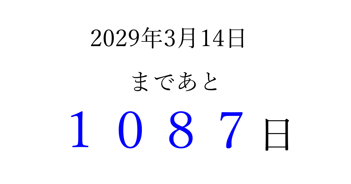 2029年3月14日(水)まで あと 9999 日です 追加すると、トップページからすぐ選べるようになります ※2026/03/23現在の結果です。 最新の状態に更新する ↓シェアして、タイムライン上にカウントダウンを表示しよう!↓ 📤 この結果を共有する Tweet シェア Threads Bluesky 別の日付でカウントダウン 2029年3月のカレンダー このページをブックマークに追加すると、いつでもカウントダウンを確認できます。 (PC: Ctrl+D / Mac: ⌘+D) hitome-notes.comでは以下のページも運営しています。 指定日と期間から日付を計算 | ガチャ確率計算・シミュレーション | プライバシー・ポリシー 運営者:Avocado