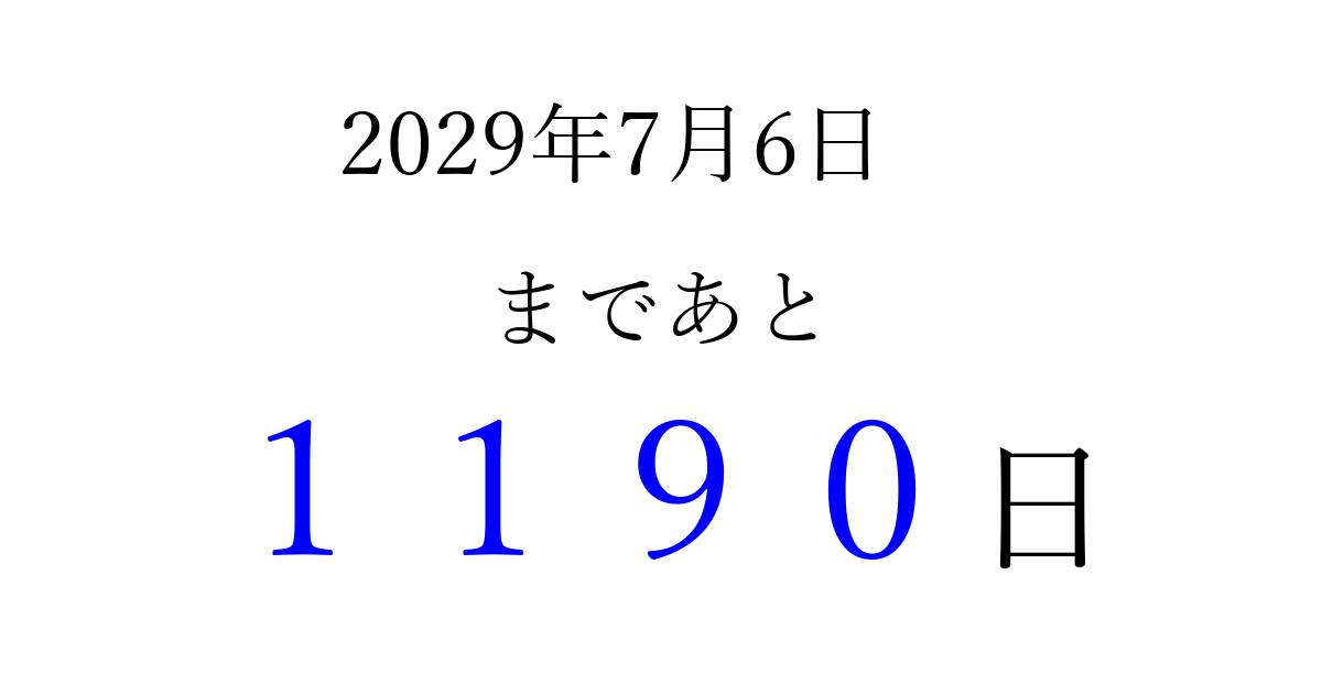 2029年7月6日(金)まで あと 9999 日です 追加すると、トップページからすぐ選べるようになります ※2026/04/03現在の結果です。 最新の状態に更新する ↓シェアして、タイムライン上にカウントダウンを表示しよう!↓ 📤 この結果を共有する Tweet シェア Threads Bluesky 別の日付でカウントダウン 2029年7月のカレンダー このページをブックマークに追加すると、いつでもカウントダウンを確認できます。 (PC: Ctrl+D / Mac: ⌘+D) hitome-notes.comでは以下のページも運営しています。 指定日と期間から日付を計算 | ガチャ確率計算・シミュレーション | プライバシー・ポリシー 運営者:Avocado