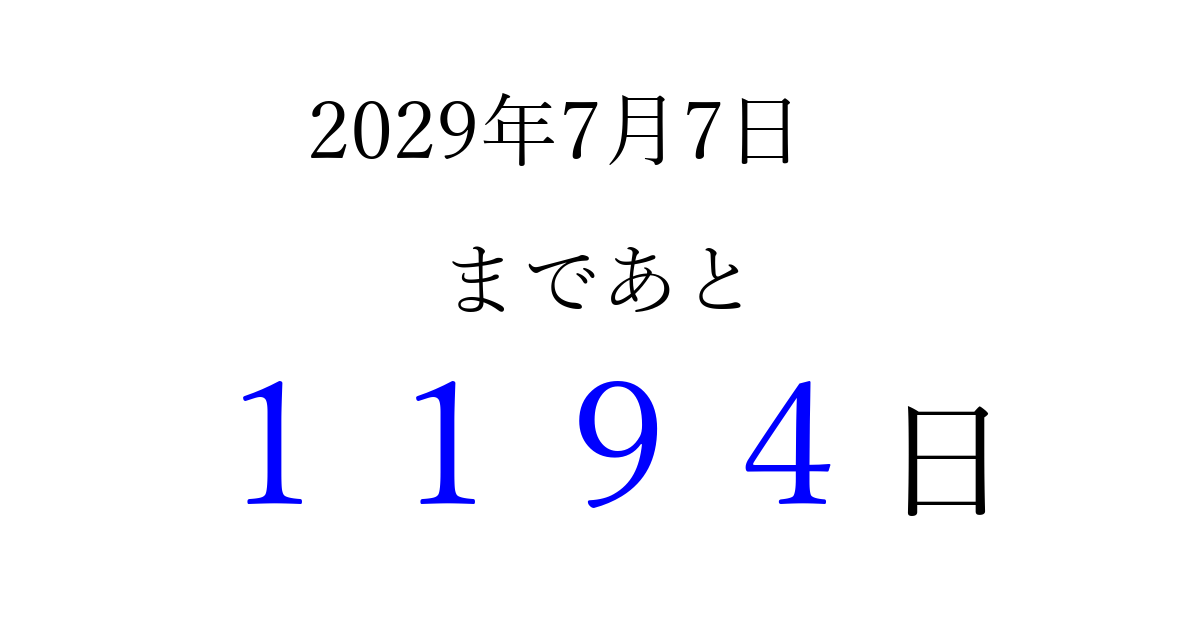 2029年7月7日(土)まで あと 9999 日です 追加すると、トップページからすぐ選べるようになります ※2026/03/31現在の結果です。 最新の状態に更新する ↓シェアして、タイムライン上にカウントダウンを表示しよう!↓ 📤 この結果を共有する Tweet シェア Threads Bluesky 別の日付でカウントダウン 2029年7月のカレンダー このページをブックマークに追加すると、いつでもカウントダウンを確認できます。 (PC: Ctrl+D / Mac: ⌘+D) hitome-notes.comでは以下のページも運営しています。 指定日と期間から日付を計算 | ガチャ確率計算・シミュレーション | プライバシー・ポリシー 運営者:Avocado